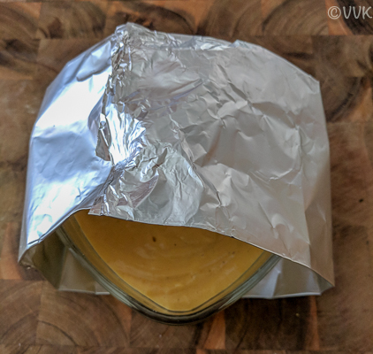 As we are steaming the cake, the condensation process occurs, and we don’t want the water droplets to fall on the cake and make it soggy. As my cake pan was small, I did not cover it and used my sling as the cover. The aluminium sling helps to take out the cake easily from the instant pot.