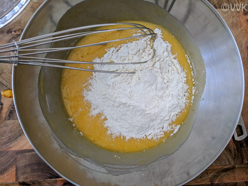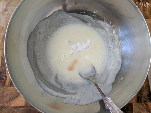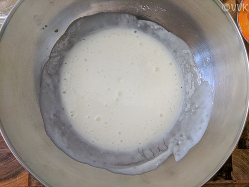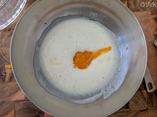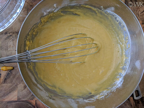 - The mixture for your Eggless Mango Cake will be emulsified now.