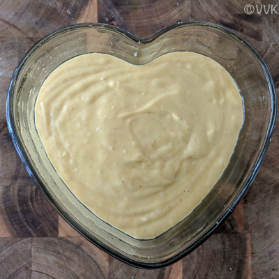 - Make sure there aren’t any lumps. Pour this cake batter into the cake pan and spread it evenly.