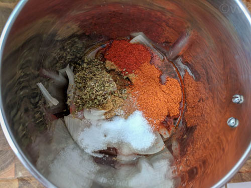 - Also, add all the spices, except vinegar and rice flour and puree it.