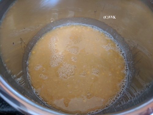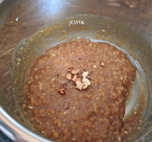- If you feel your jaggery might contain impurities, heat ¼ cup of water and melt the jaggery in it. And then strain it and add the jaggery mix to the channa dal.