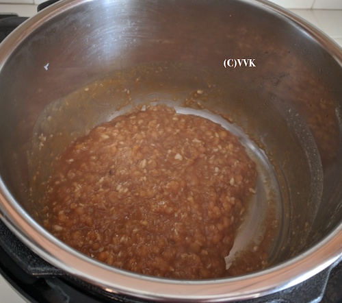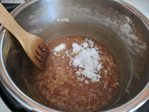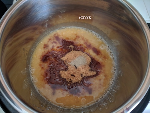 - Set the IP to saute mode and add the jaggery, cloves, cardamom powder.
