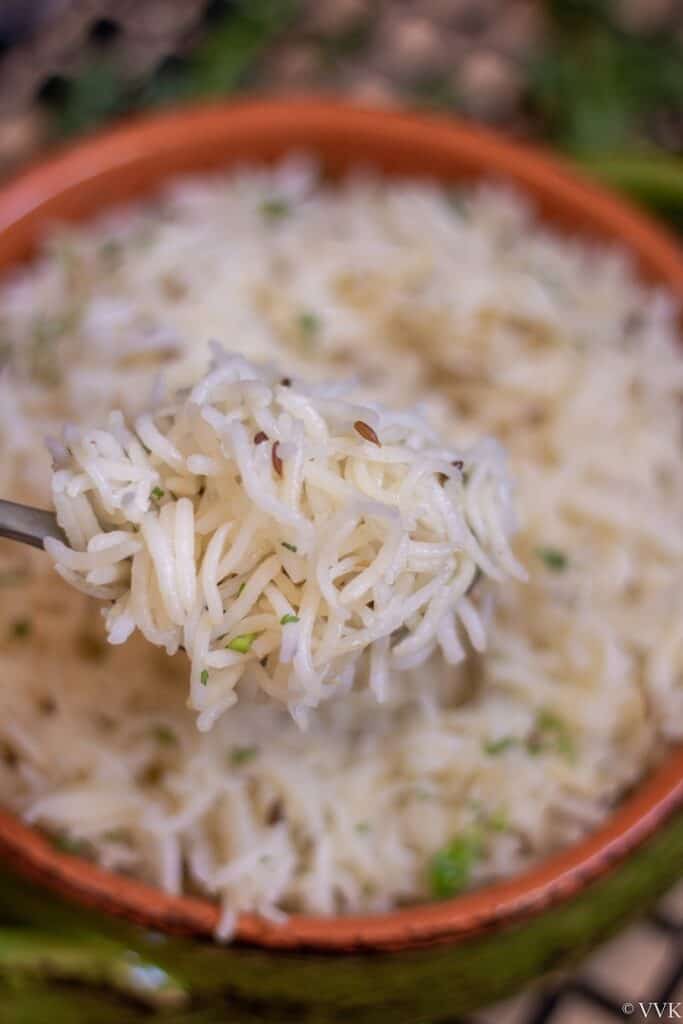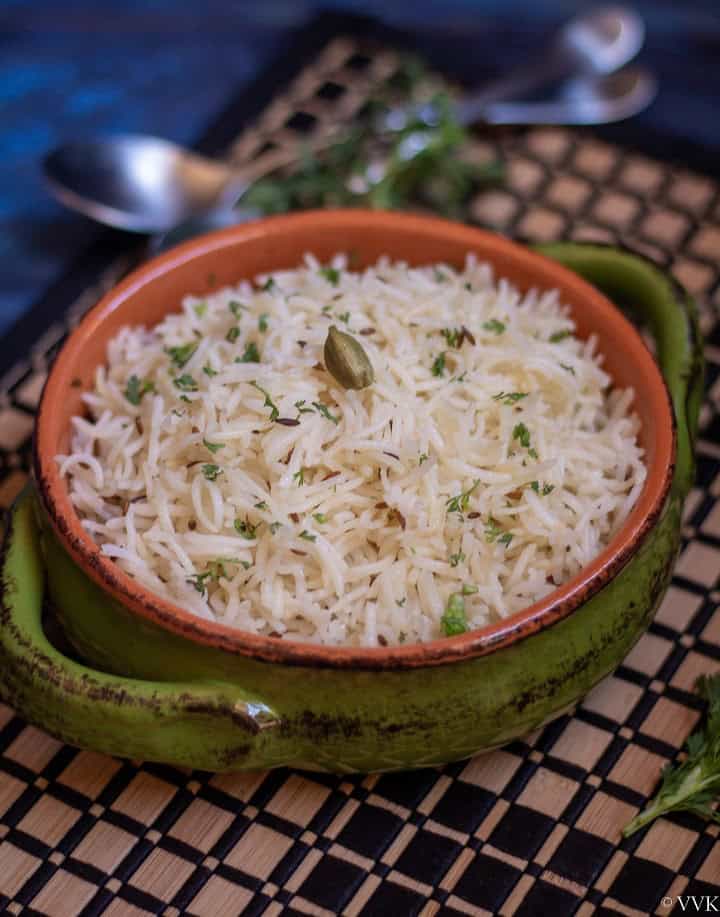 Traditionally, we use basmati rice for making this jeera rice, and I have shared the water measurement and timing for basmati rice in this post. Please check the notes for other rice varieties.