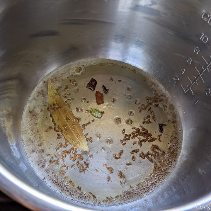 ✔ Set the Instant Pot in saute mode and add the ghee. Let the ghee melt, and when it is hot, add the cumin seeds, cardamom, cloves, cinnamon, bay leaf.