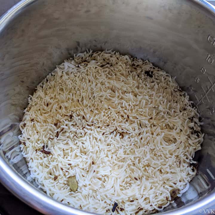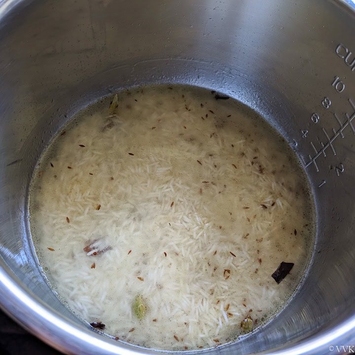 Guess what? Making jeera rice at home is not so tricky. Especially with Instant pot, it is effortless, and you get perfect non-mushy rice every time. I rely on the Instant Pot rice setting. In the rice mode, IP cooks rice in the low-pressure mode for 12 minutes. I let the pressure release naturally, as well.