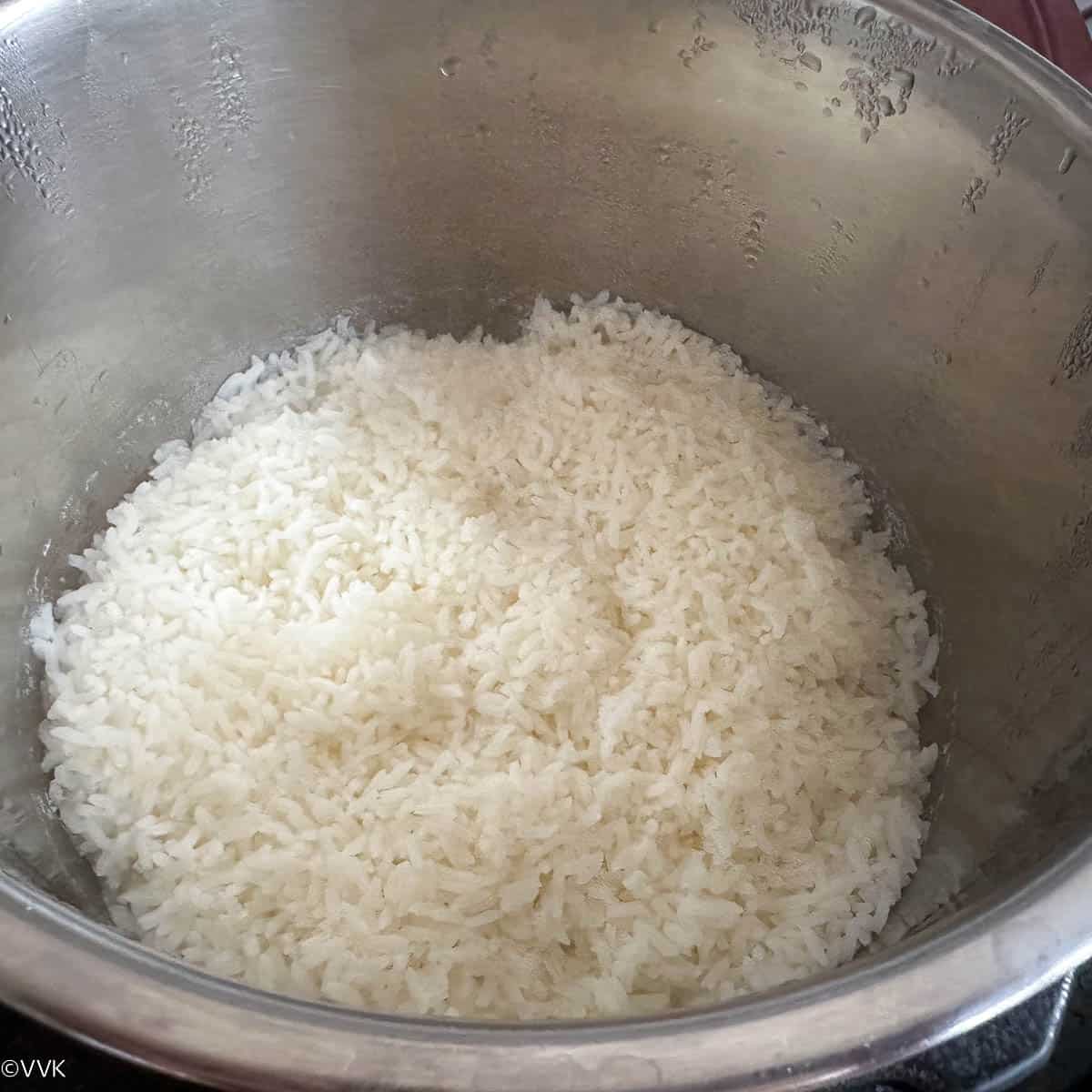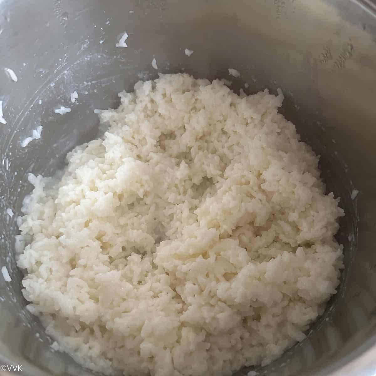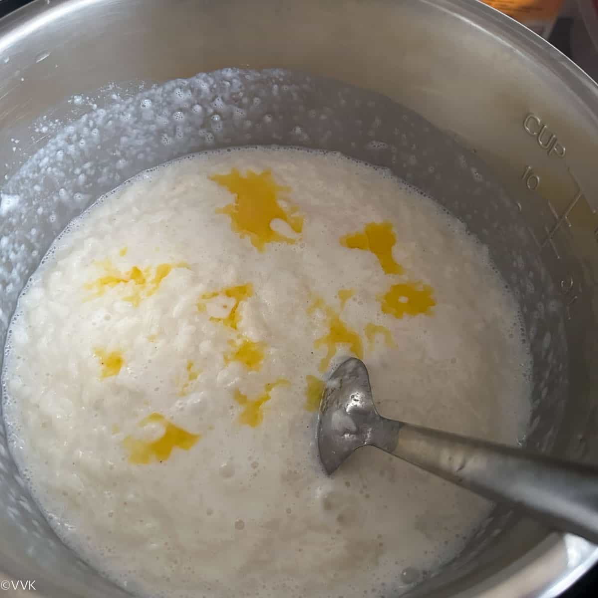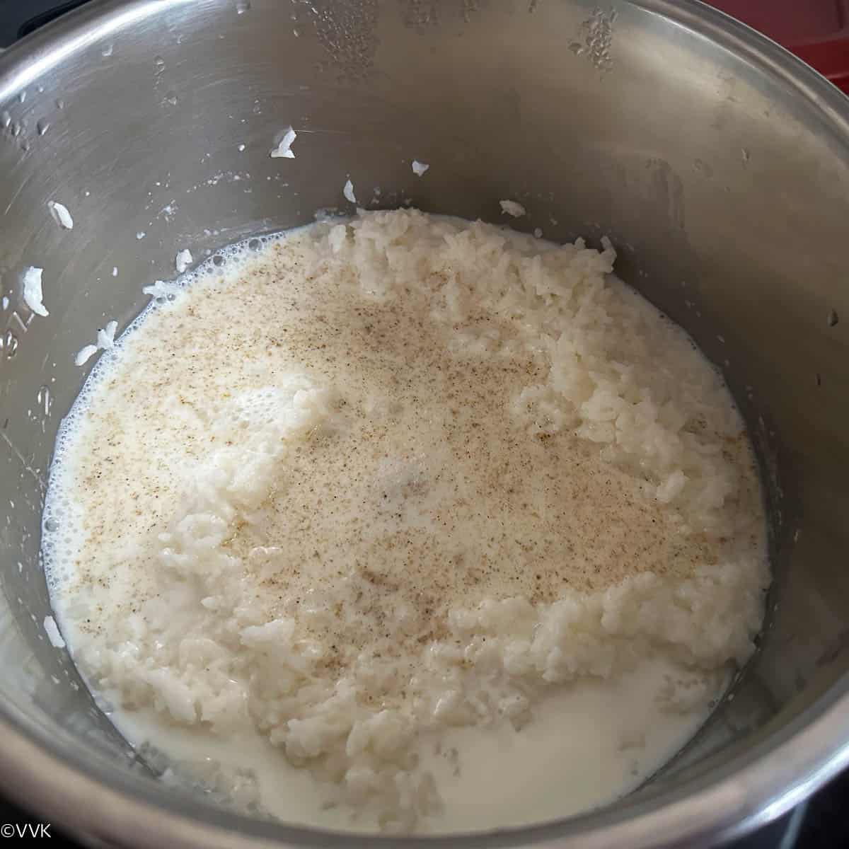 - Open the lid and mash the rice thoroughly. (Instead of IP, you can pressure cook rice with milk and water for up to four whistles)