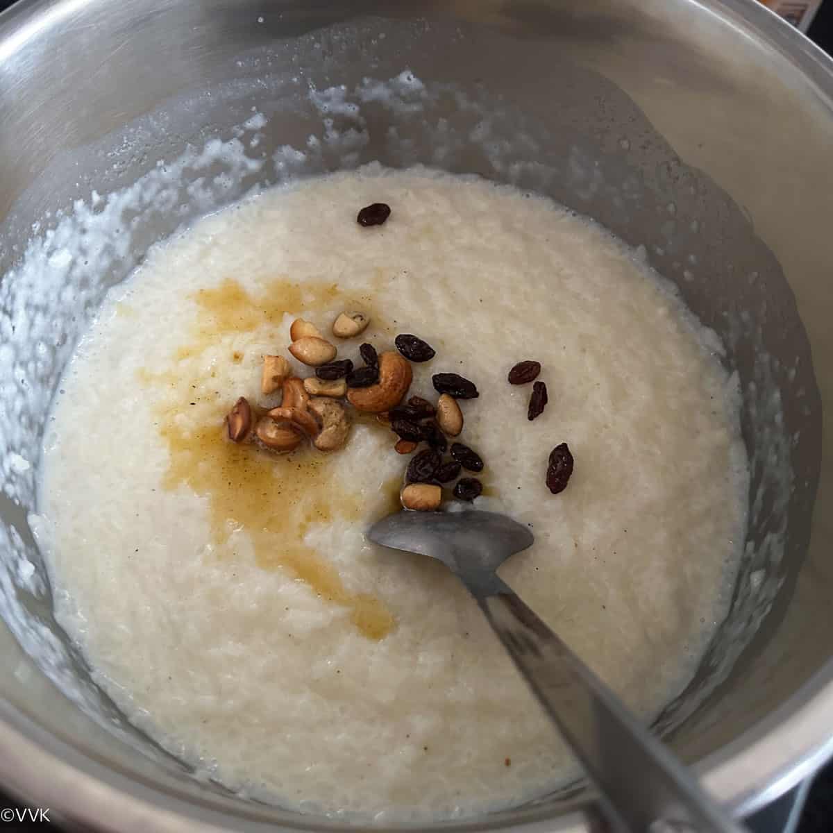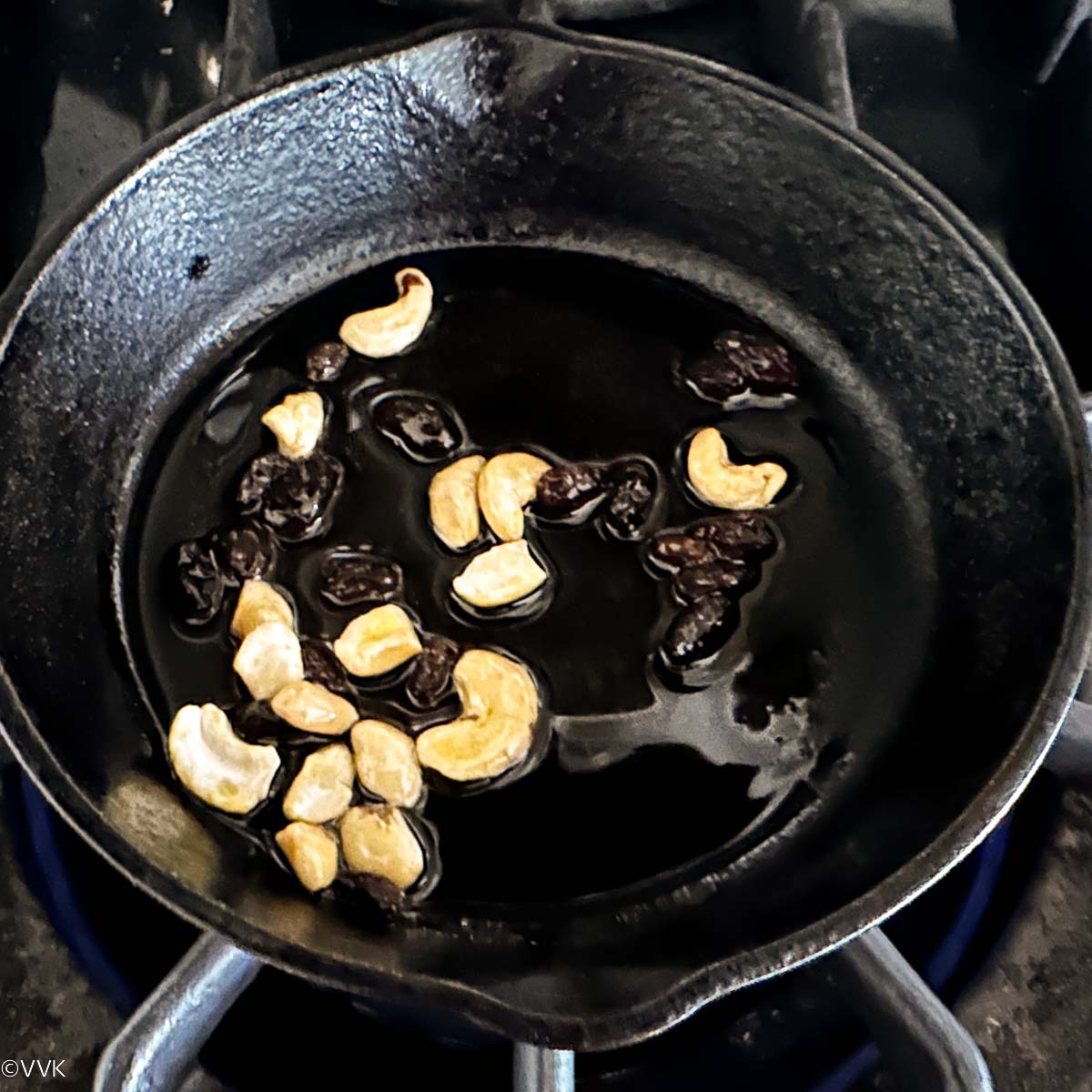 - Now in a separate tempering pan, heat the ghee. Once the ghee is hot, add the cashews and raisins, and fry until golden brown.