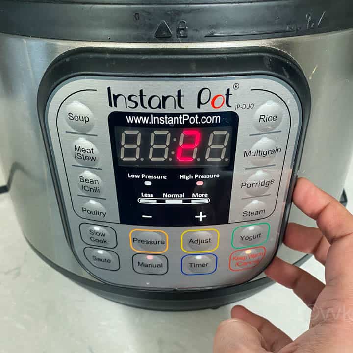 - Place the inner pot inside the Instant Pot. Now close the Instant Pot. Make sure the sealing ring is in place and set the vent to the sealing position. Press the pressure cook / manual button and set the cooking time as 2 minutes at high-pressure.