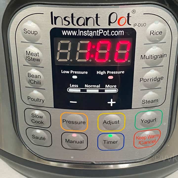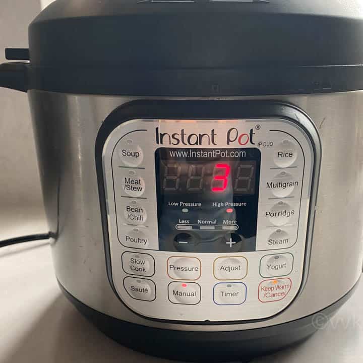- Now close the Instant Pot. Make sure the sealing ring is in place and set the vent to the sealing position. Press the pressure cook / manual button and set the cooking time as 3 minutes at high-pressure.