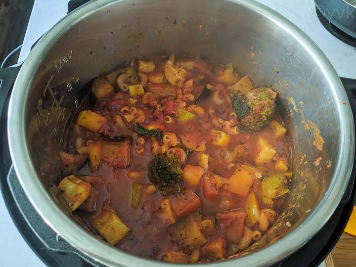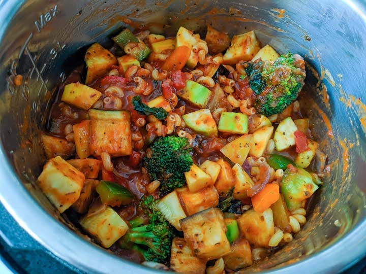 - If you are using sturdy vegetables like potatoes, beets, carrots, the first cook the vegetables without adding pasta for two minutes and release the pressure after five minutes, then add the pasta and cook again for 3 minutes and quickly release the pressure. I would recommend the ratatouille vegetables for this pasta.