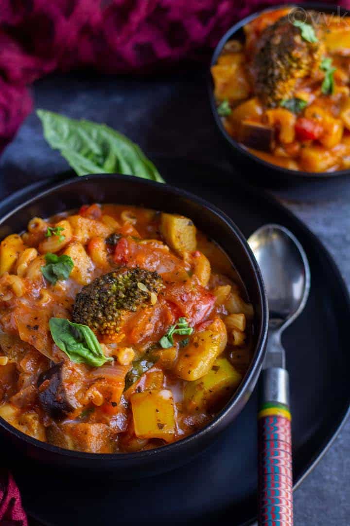 This Instant Pot pasta recipe was one of my go-to recipes during our kitchen renovation. It’s super easy to make, and you can comfortably customize it with what you have in your pantry. Today I made it more like pasta soup/stew. I can call this as my vegan version of ratatouille pasta soup. :-)
