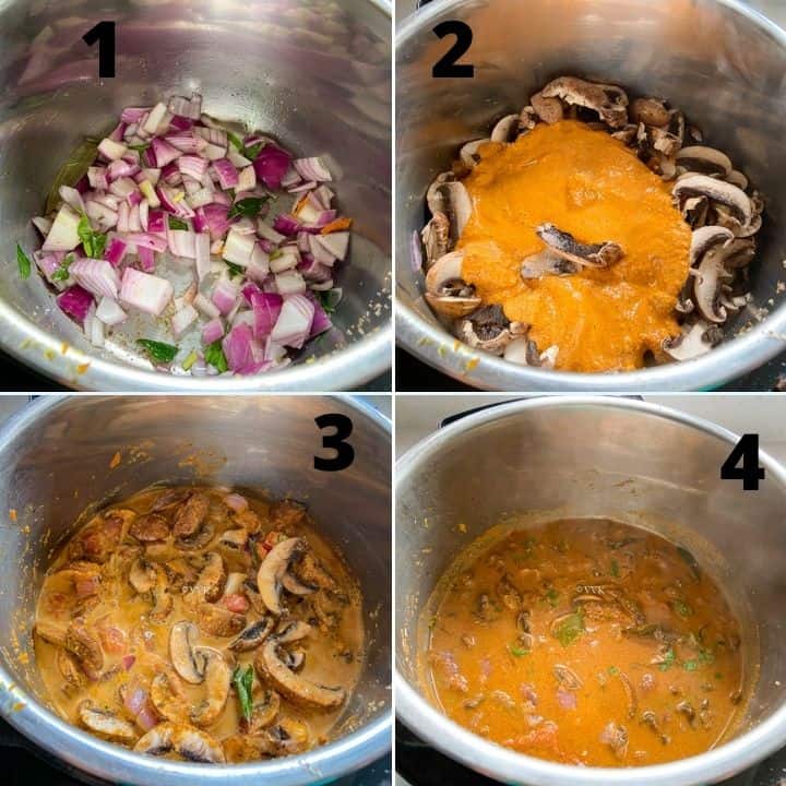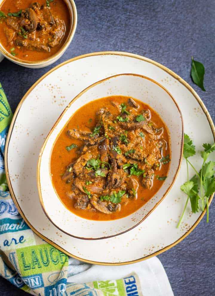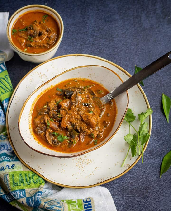 Check out how to make this mushroom kuzhambu (vegan and gluten-free) with step-wise pictures.
