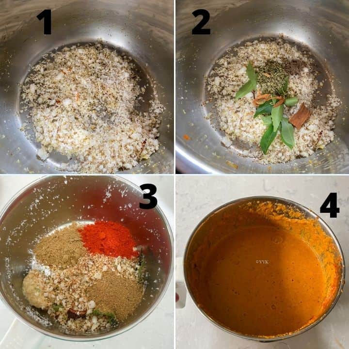 - It’s optional to grind the spice powders along with coconut. You can add it along with tomatoes and cook. I recently started following this way as it’s easy, and I don’t need to worry about lumps. The spices integrate well in the gravy. But make sure you simmer the gravy so that the raw smell of spices weans away.