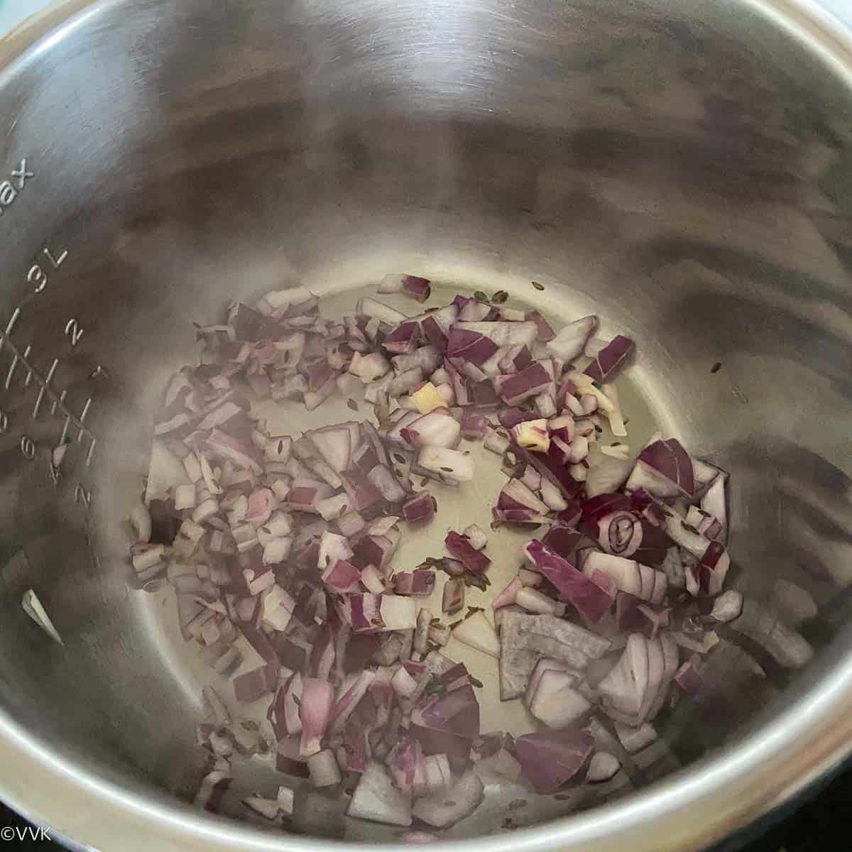 - Set the Instant Pot in saute mode. Add the oil, and when it is hot, add the cumin seeds. Let the cumin seeds crackle, add the chopped onions, and saute until they turn translucent. Turn off the Instant Pot.