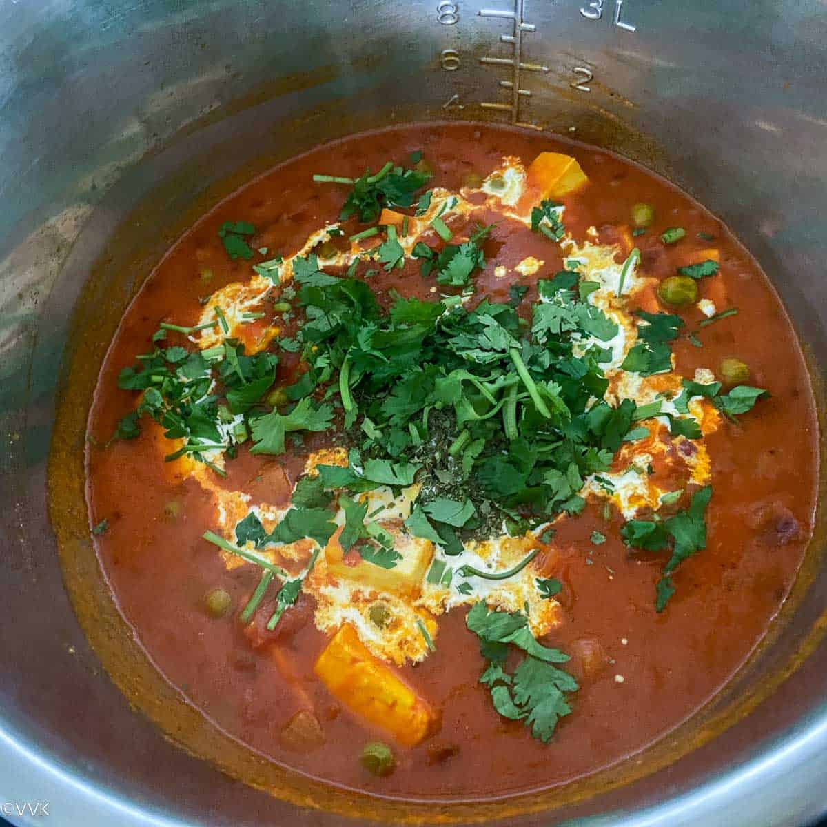 - Now add the cream, crushed kasoori methi, and chopped cilantro. Let it simmer for a couple of minutes, and that’s it. Instant Pot Paneer gravy is ready. Serve hot with rice and roti.