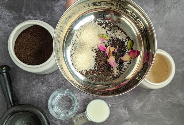 Make sure you take a tall vessel that fits well inside the instant pot when placed on a trivet. In that bowl, first add the tea, sugar, dried rosebud, and crushed green cardamom. Peeling off few petals enhances the flavor further.