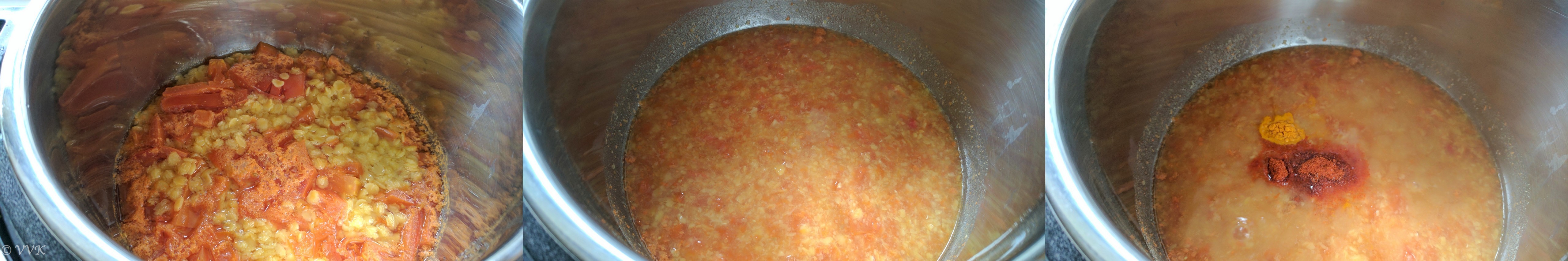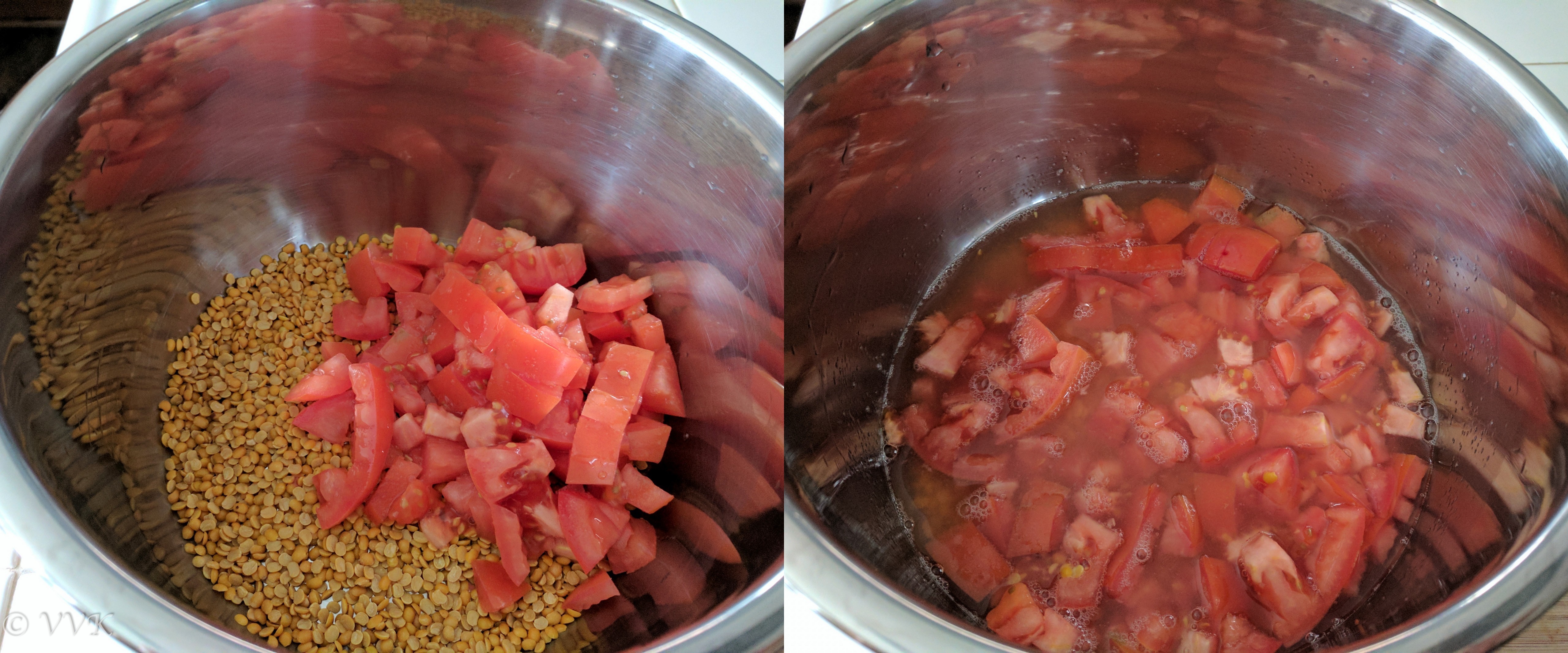 Add the washed dal, tomatoes and 1.5 cups of water and cook in manual mode for 15 minutes.