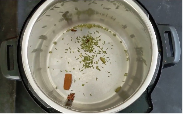 - Set the Instant Pot in the “saute” mode and when the display shows hot, add the oil. Wait for 30 seconds and then add the whole spices – fennel seeds, cardamom, cloves, star anise, and cinnamon.