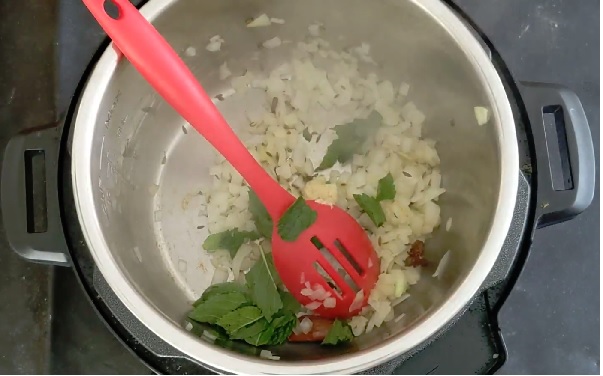 - Set the Instant Pot in the “saute” mode and when the display shows hot, add the oil. Wait for 30 seconds and then add the whole spices – fennel seeds, cardamom, cloves, star anise, and cinnamon. Mix and fry it for just 10 seconds. We don’t want the fennel seeds to brown up.