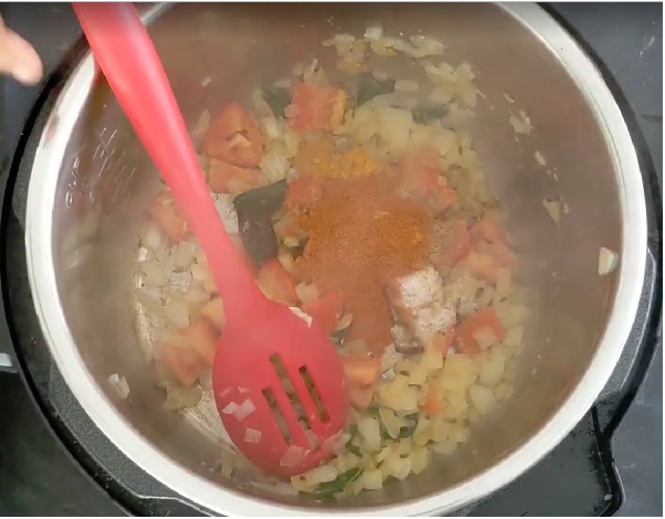 - Then add the chopped tomatoes. Gently stir and add salt all the spice powders – salt, garam masala, turmeric powder, coriander powder, and red chili powder. Mix thoroughly — Cook for a minute.