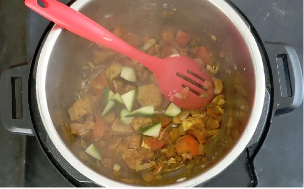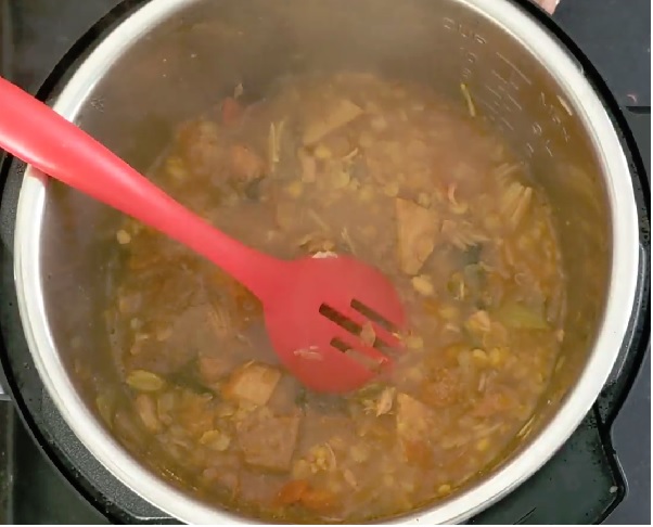 - Now carefully open the Instant Pot and set the Instant Pot back to “saute” mode. Mash the lentils and tender jackfruit.