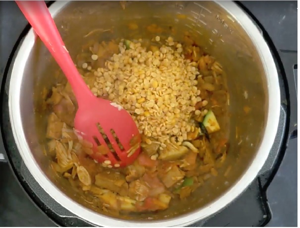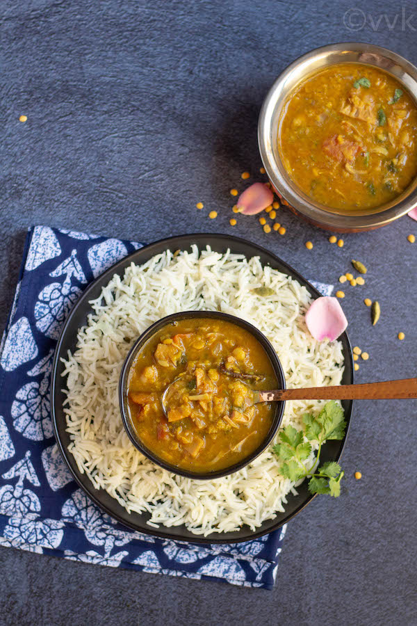 I made this in my Instant Pot as a one-pot meal. You can make this in the pressure cooker also. If you are using soft vegetables like brinjal, bottle-gourd or pumpkin, and don’t prefer mushy vegetables, then pressure cook the dal separately. After cook, the dal, in wok or saucepan, do the tempering, saute the onion and tomato. Add in the spices and the vegetables. Add some water and cook until the vegetables are soft and tender. Then add the cooked dal.
