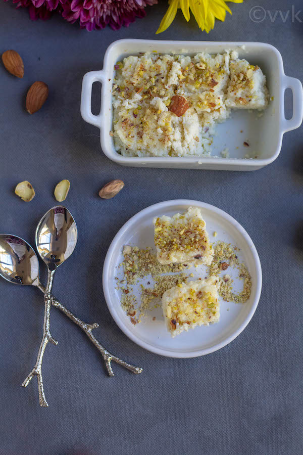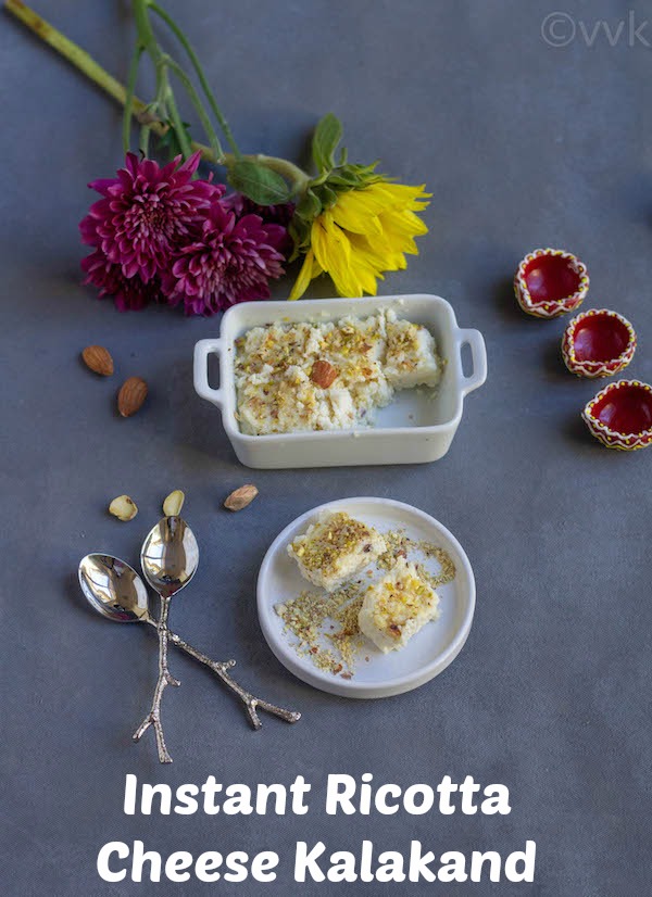 Diwali without a ricotta cheese sweet is incomplete in our household. I love to make sweets with ricotta cheese. It was ricotta cheese rasamalai in 2016 and Sandesh in 2017 and now Kalakand in 2018. I have one more coming up on Friday so stay tuned.