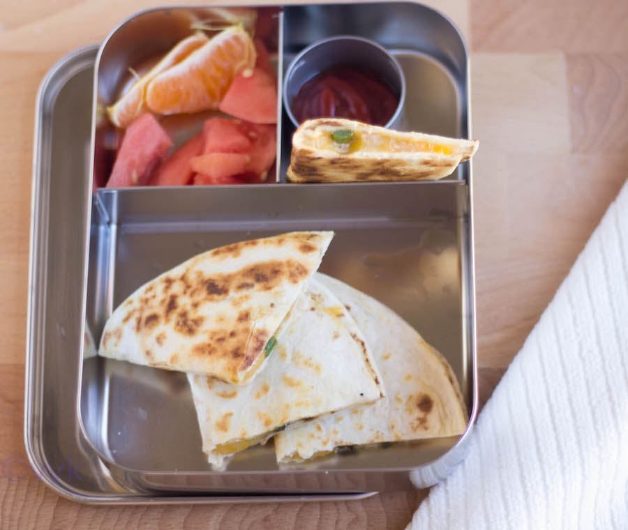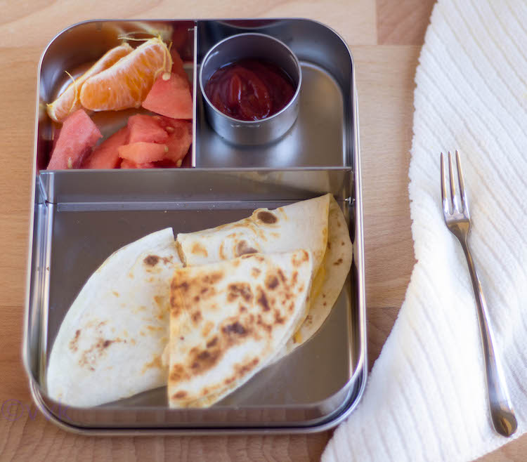 - Spread a tissue on the lunch box and place the quesadillas on top and close it with the lid.