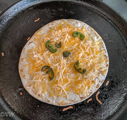 - Now heat a griddle or tawa and when it is hot, place the flour tortilla and spread ¼ tsp of oil. Heat it for 20 seconds on one side and flip. Now reduce the heat thoroughly, and spread the cheese and then top it with the sauteed jalapeno pieces.