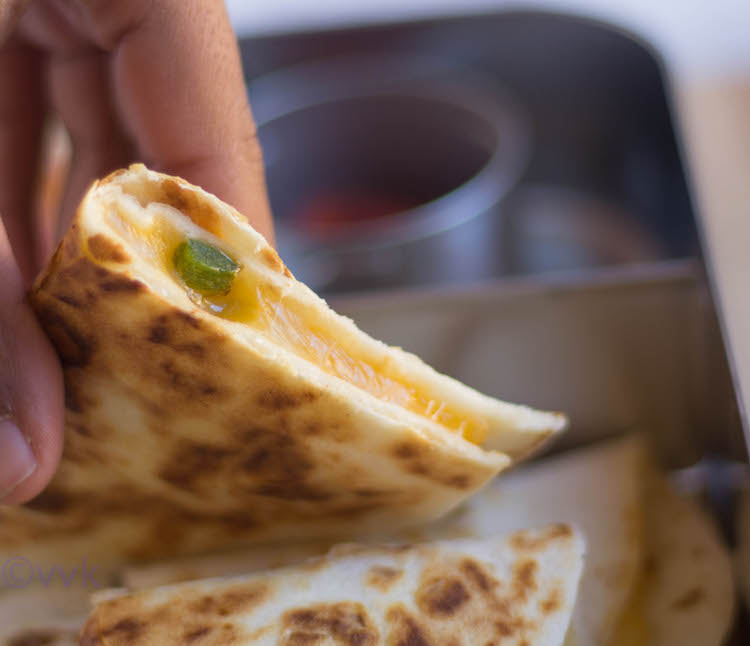 For making two quesadillas, I used only half of the jalapeno pepper, approx. 1 tbsp when chopped. By the way, I had difficulties clicking the pictures because Vaandu couldn’t wait. So I had to rush and snapped only a few of them. The images may not be enticing, but I guarantee the dish inside is.