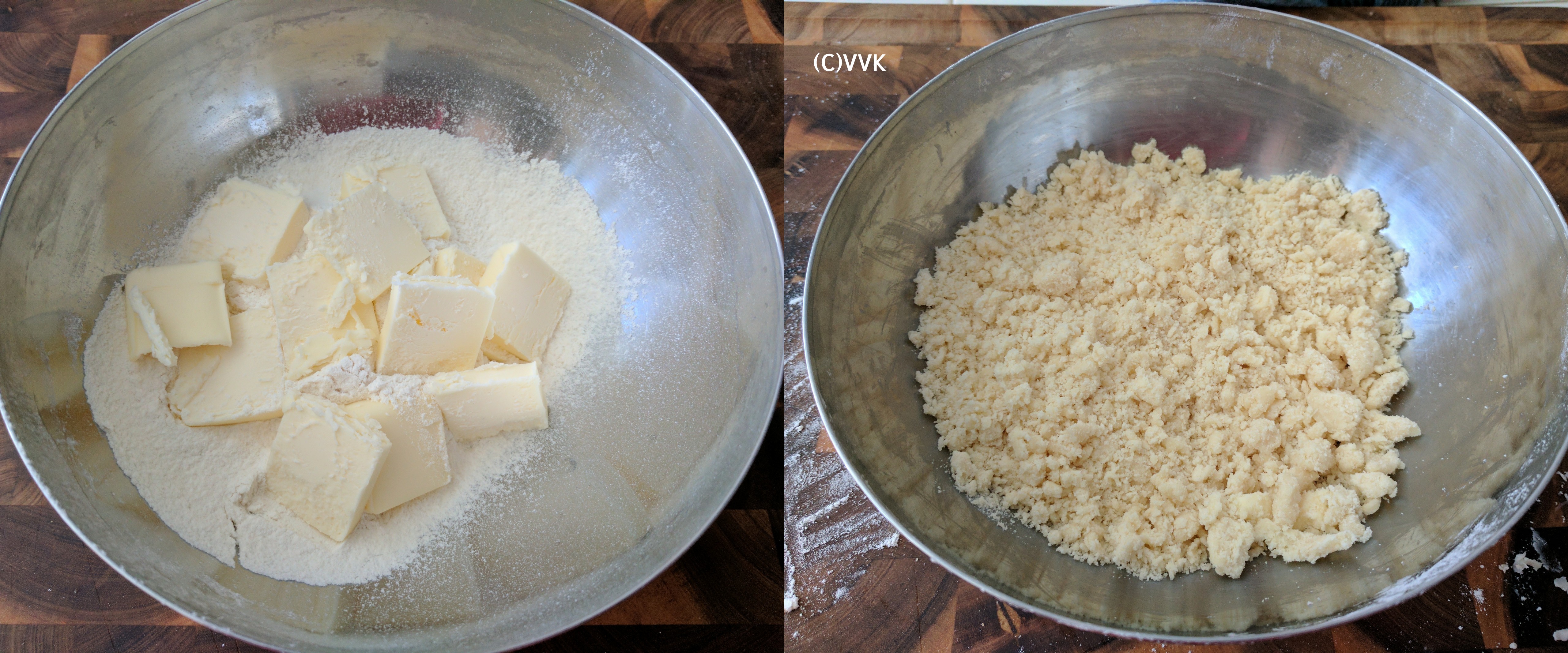 - Work quickly and rub the butter into the flour with your fingertips until the mixture resembles fine breadcrumbs.