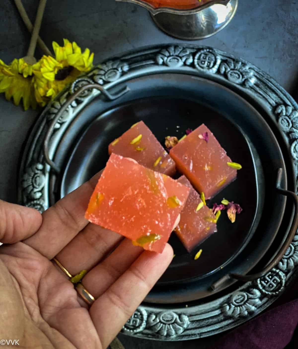 It’s time for another sweet recipe, a distant cousin of Turkish delight – the Karachi halwa. I am not sure why it is called Karachi halwa or Bombay (present Mumbai) halwa, but the name corn flour halwa fits it as we prepare the sweet with corn flour or corn starch. It’s a pretty straightforward recipe with minimal ingredients.