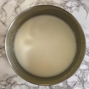 - Mix ½ cup of corn starch and 1 cup of water without any lumps and set aside. Grease a plate generously with ghee and set it aside.