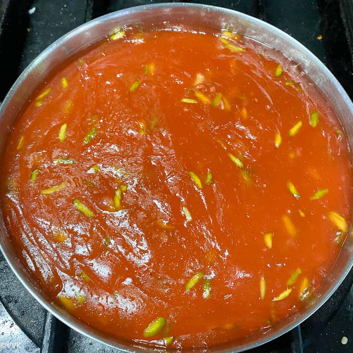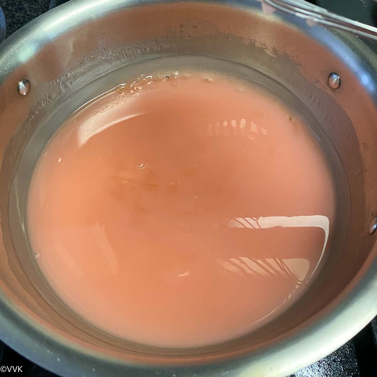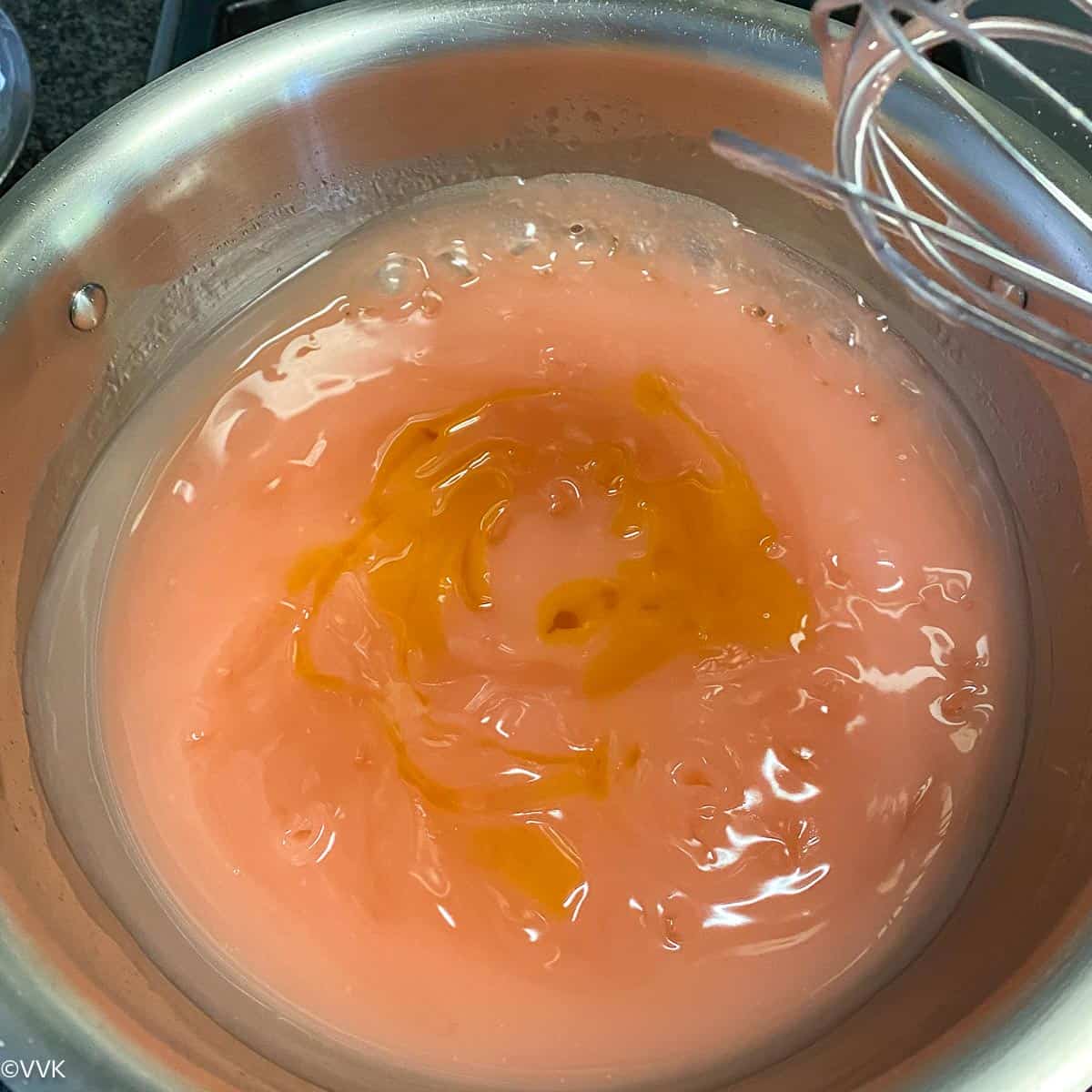 - Before adding the corn starch slurry to the sugar mix, mix well again as the corn starch gets deposited in the bottom. You can add the rose syrup or the food color to this slurry too.