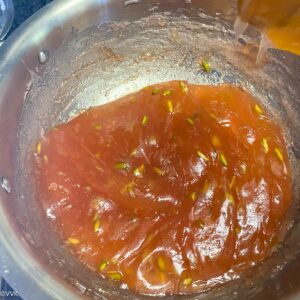 - The halwa will become glossy and transparent slowly. Add the nuts after about 5 minutes and mix.