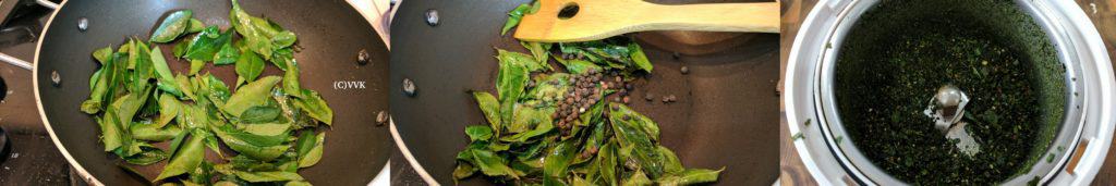 - Steps for the curry leaves mix:Heat 1 tsp oil in a pan, add curry leaves and peppercorns, and dry roast until crisp.