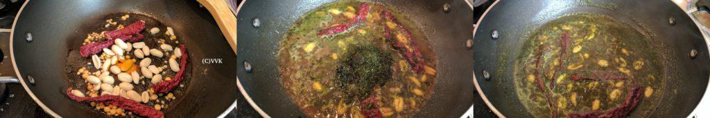 - Steps for the pulihora mix:Heat 1 tbsp oil in a pan. Add the peanuts first and roast until it's golden.