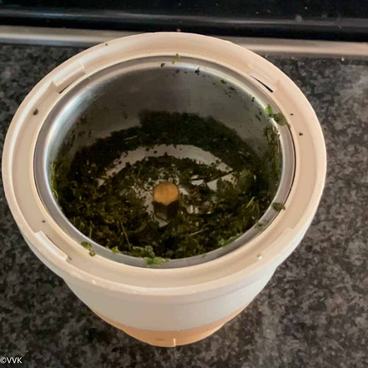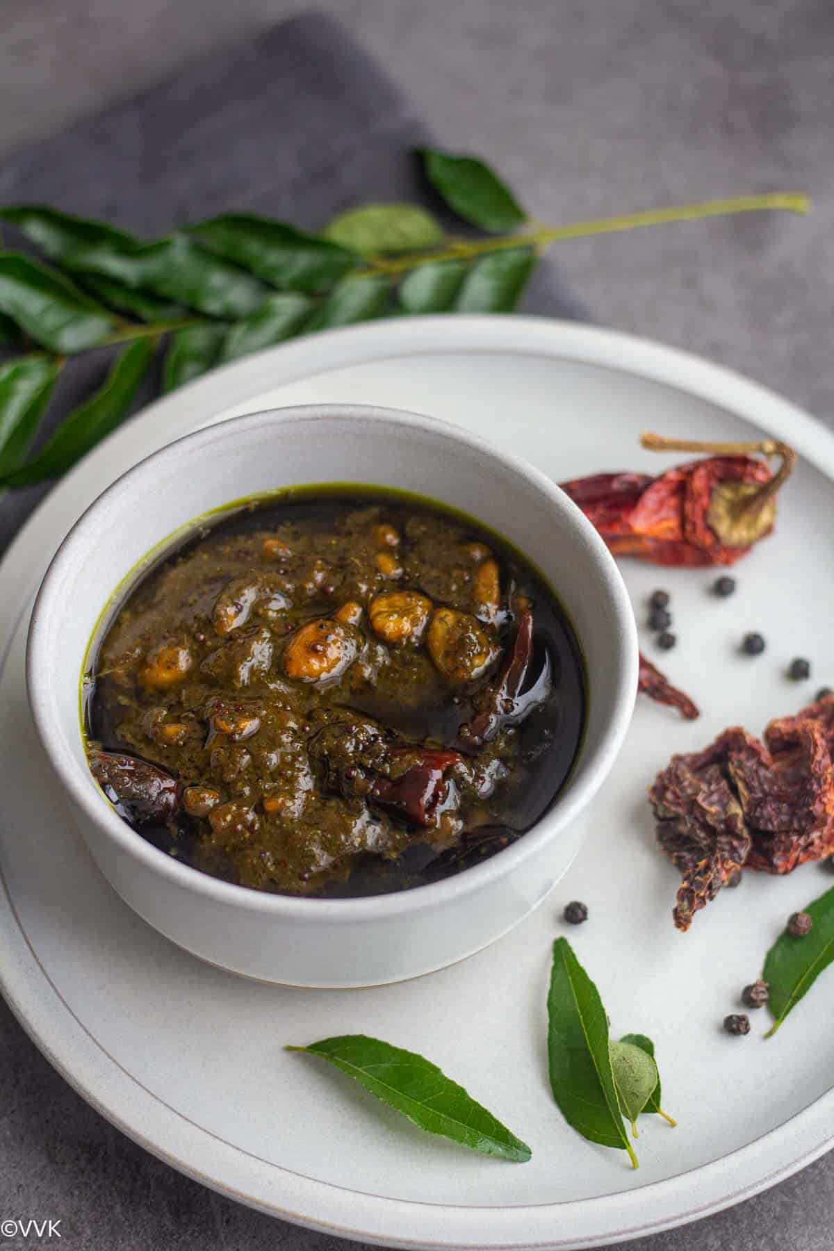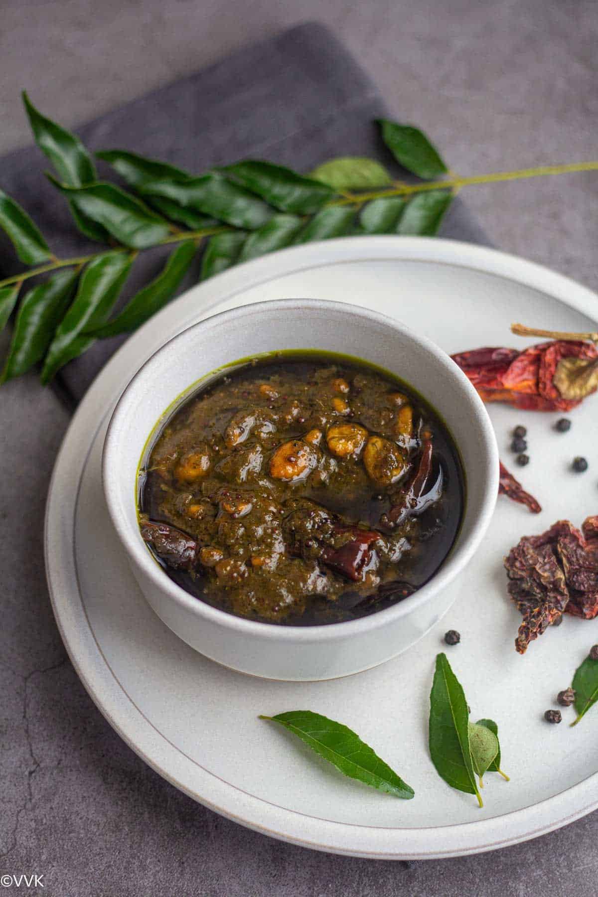 To roast and grind: We need one cup of curry leaves and 1 tsp of whole peppercorns. The combination of curry leaves and peppercorns is a match made in heaven, and that’s what we are using here, too.