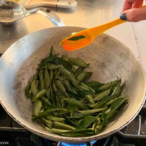 - You wash and dry the curry leaves well ahead, and make sure to roast them until they are crisp.