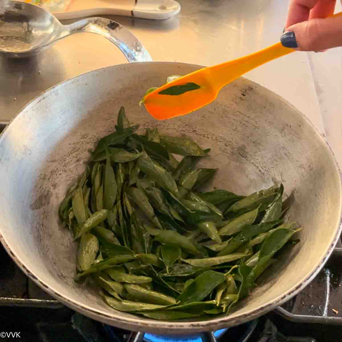 - Heat 1 tsp oil in a pan, add curry leaves and peppercorns, and dry roast until crisp.