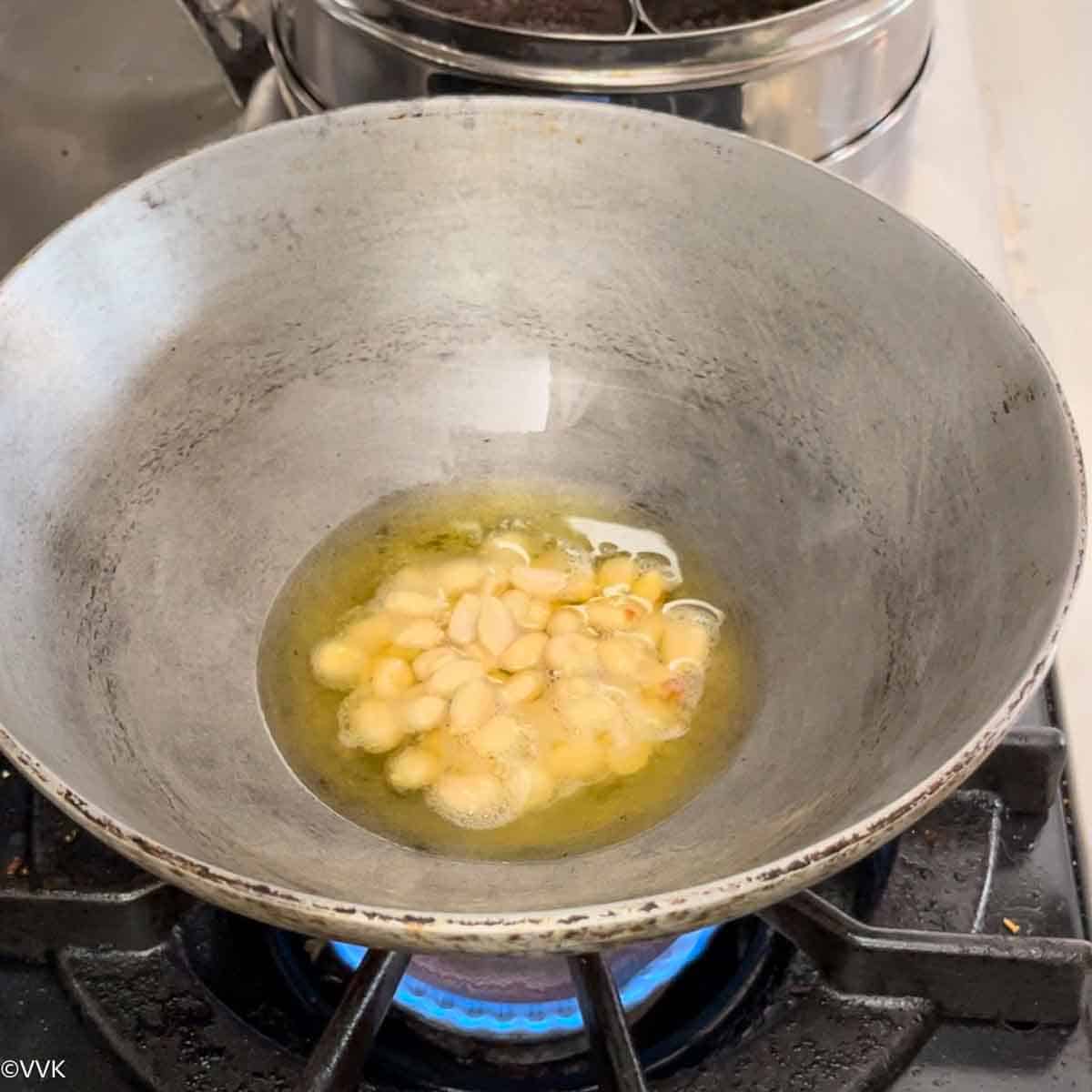- Heat 1 tbsp oil in a pan. Add the peanuts first and roast until it’s golden.