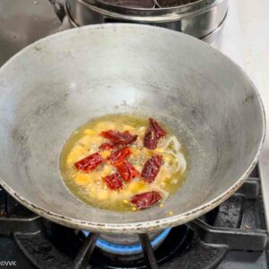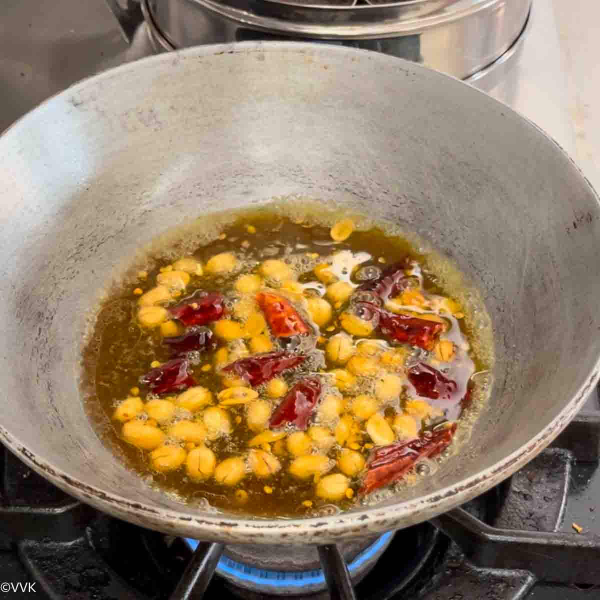 To temper – we need oil, preferably gingelly oil mustard seeds, urad dal, chana dal, peanuts, and dried red chilies.