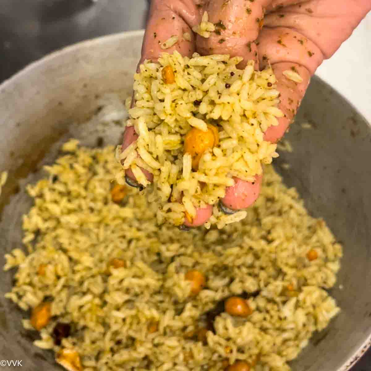 - Add enough curry leaves paste to the cooked rice and mix well.