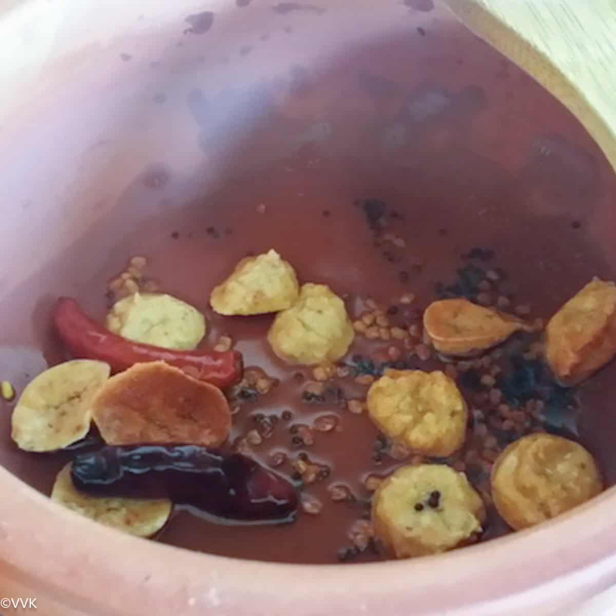 - I prepare this kuzhambu comparatively tangy and a bit more spicy than the regular vathal kuzhambu, as the soaked fryums taste better with spicy and tangy gravy. But adjust according to your preference.