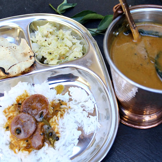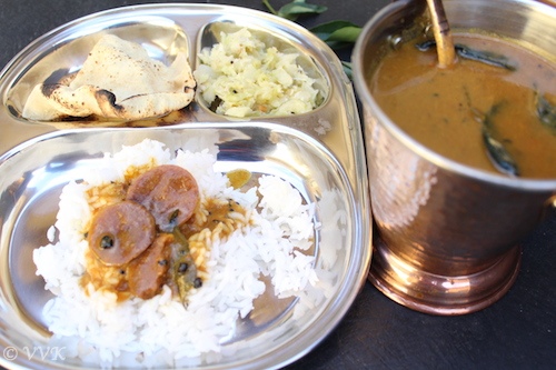 You can enjoy this vathal kuzhambu with rice and poriyals or kootu of your choice, like,
