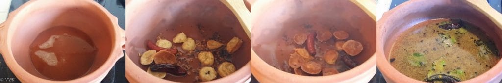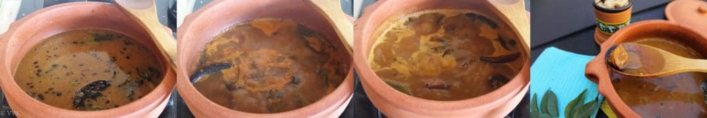 - I prepare this kuzhambu comparatively tangy and a bit more spicy than the regular vathal kuzhambu, as the soaked fryums taste better with spicy and tangy gravy. But adjust according to your preference.