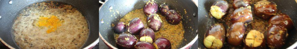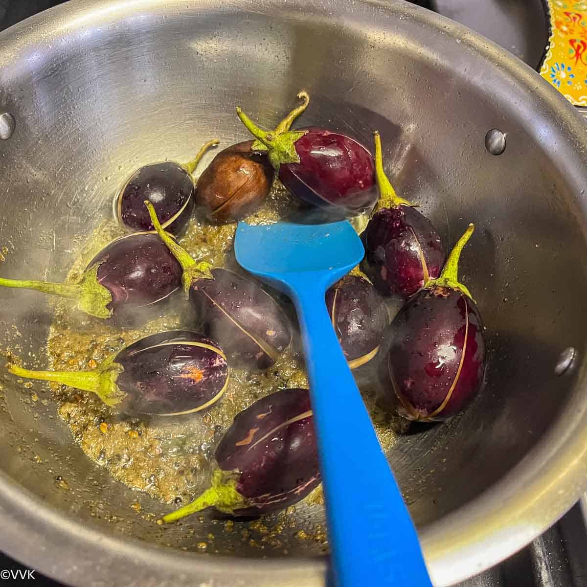 - Add the brinjals, drizzle some water, cover, and cook for about 5 to 8 minutes until tender, ensuring they are well coated with the masala.