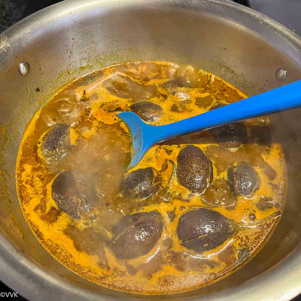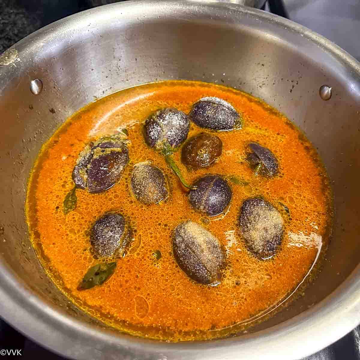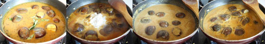 - Once it starts boiling and the brinjals are soft, stir in the ground coconut paste and let it simmer for 2–3 minutes.