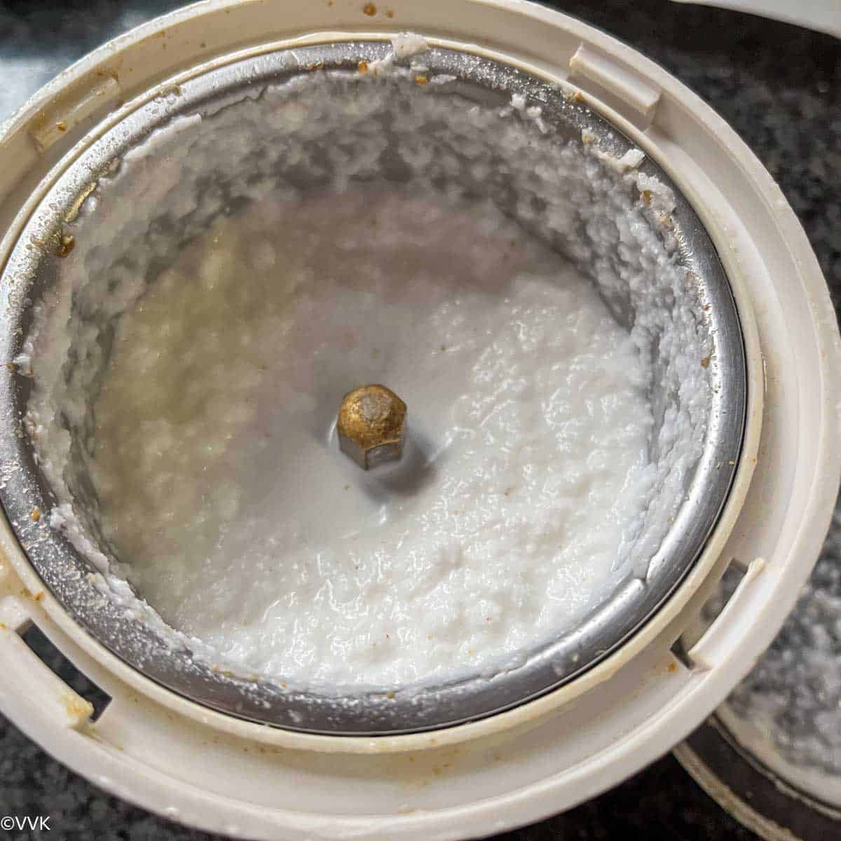 - Coarsely grind coconut with rice flour using about 2 tbsp of water. Set aside.