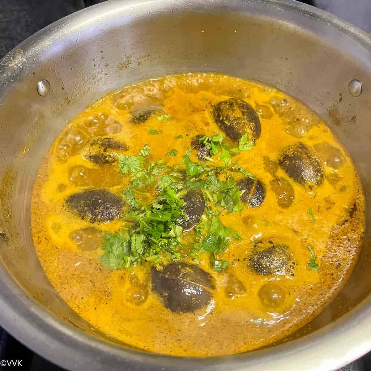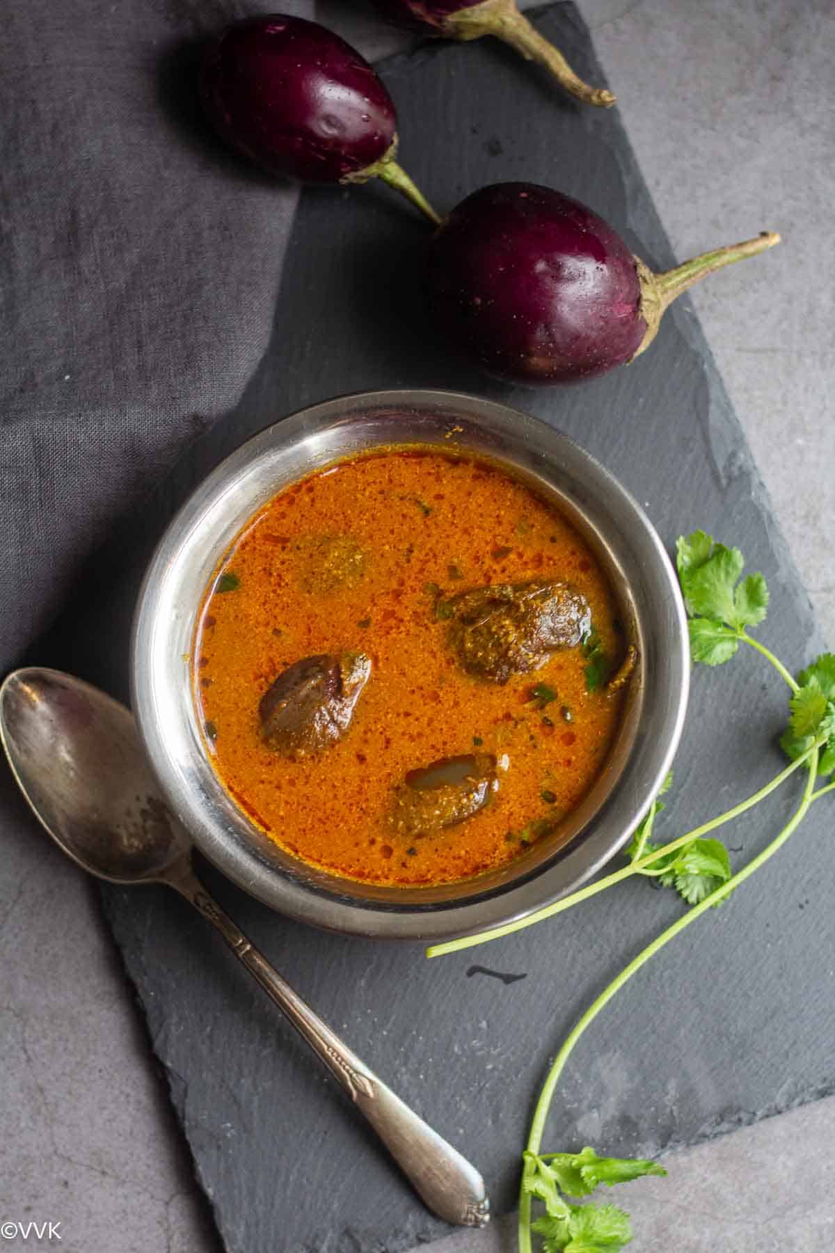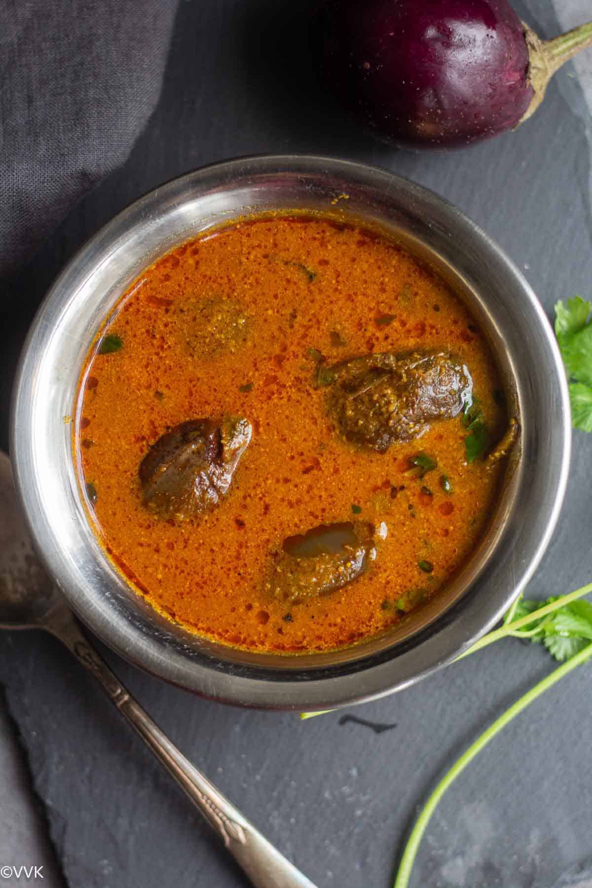 That’s it! Your delicious kathirikai puli kuzhambu is ready to be served hot with rice.